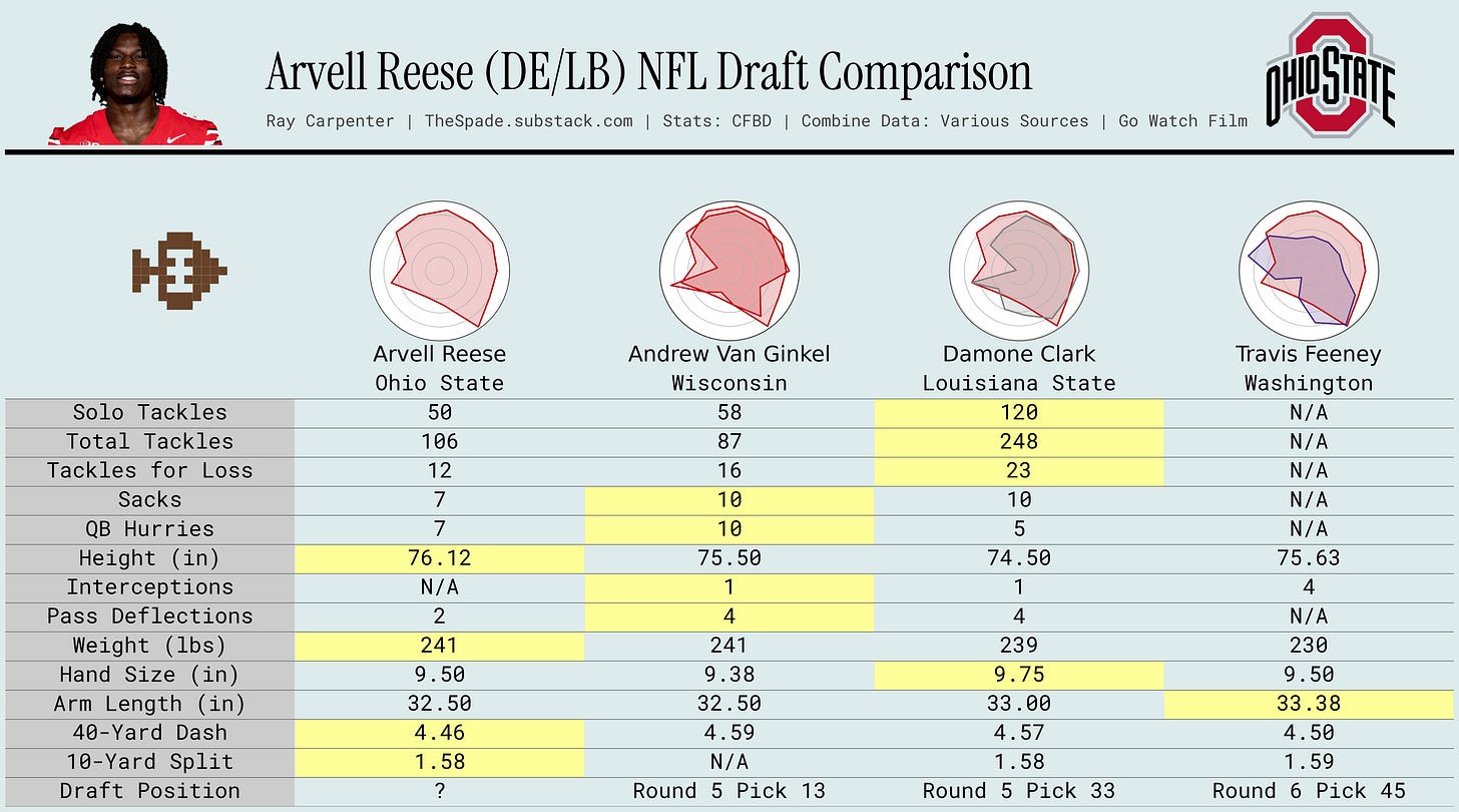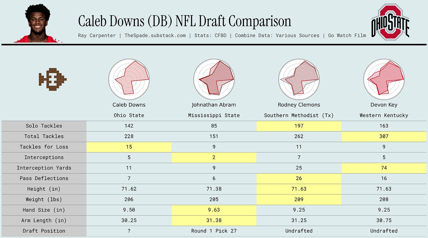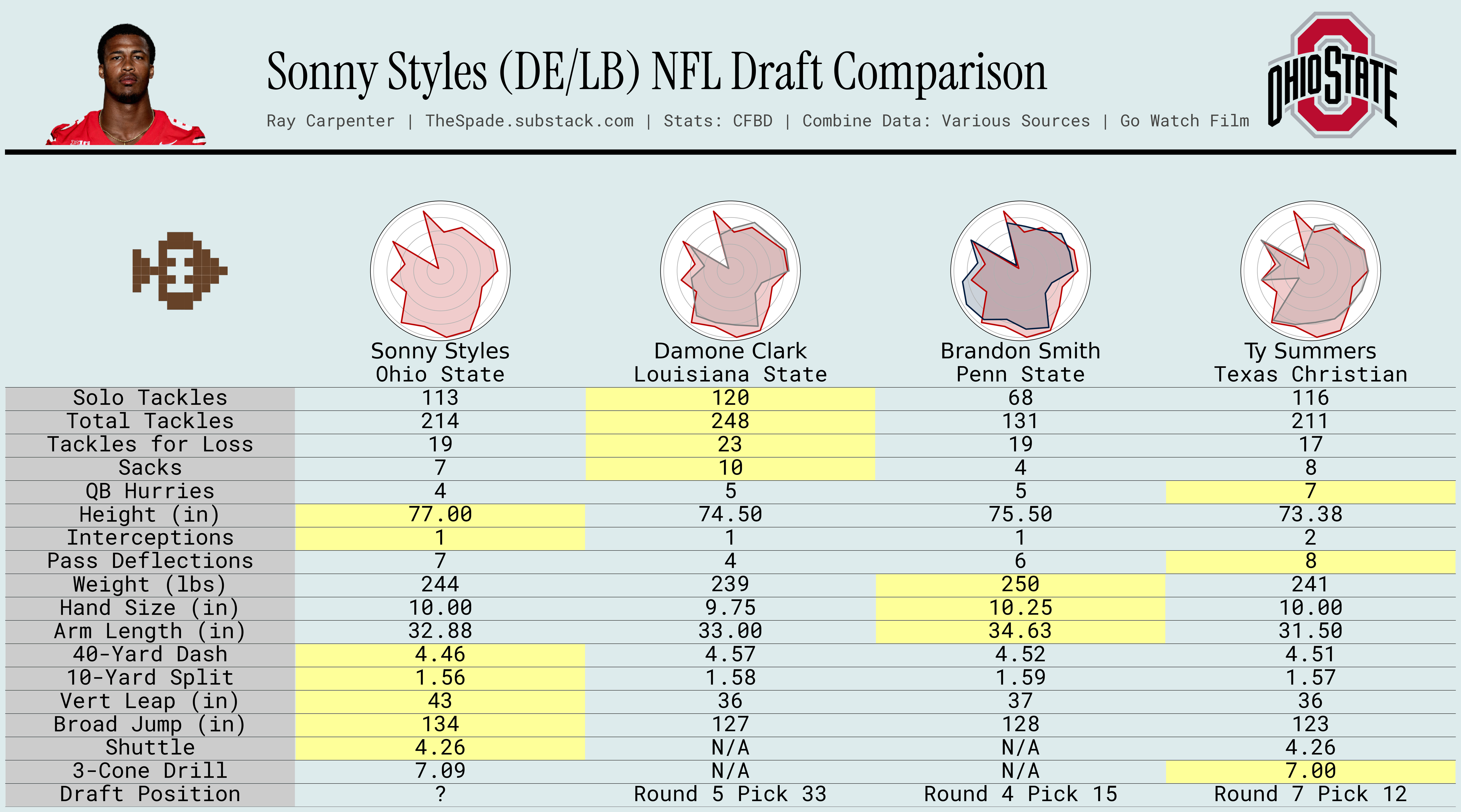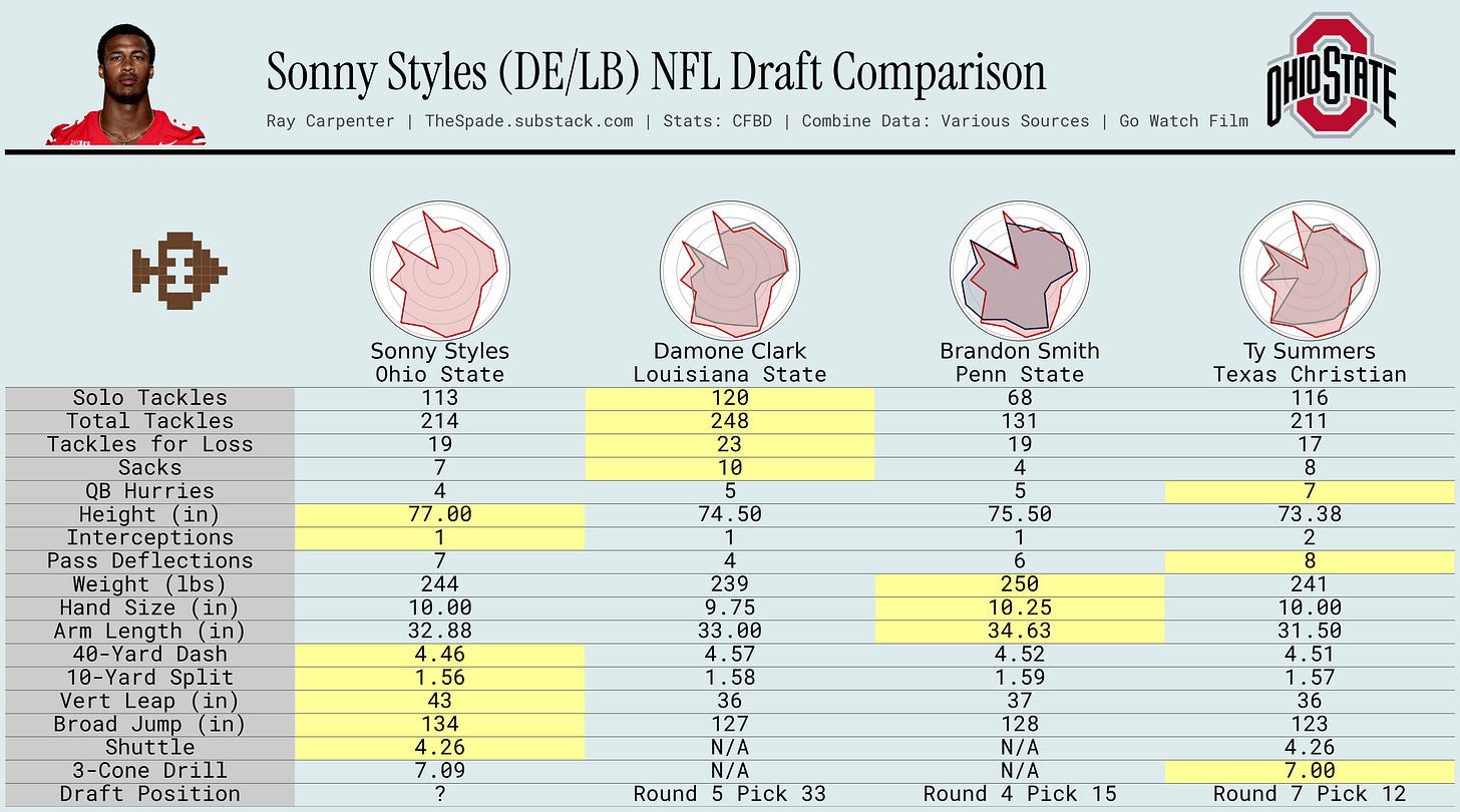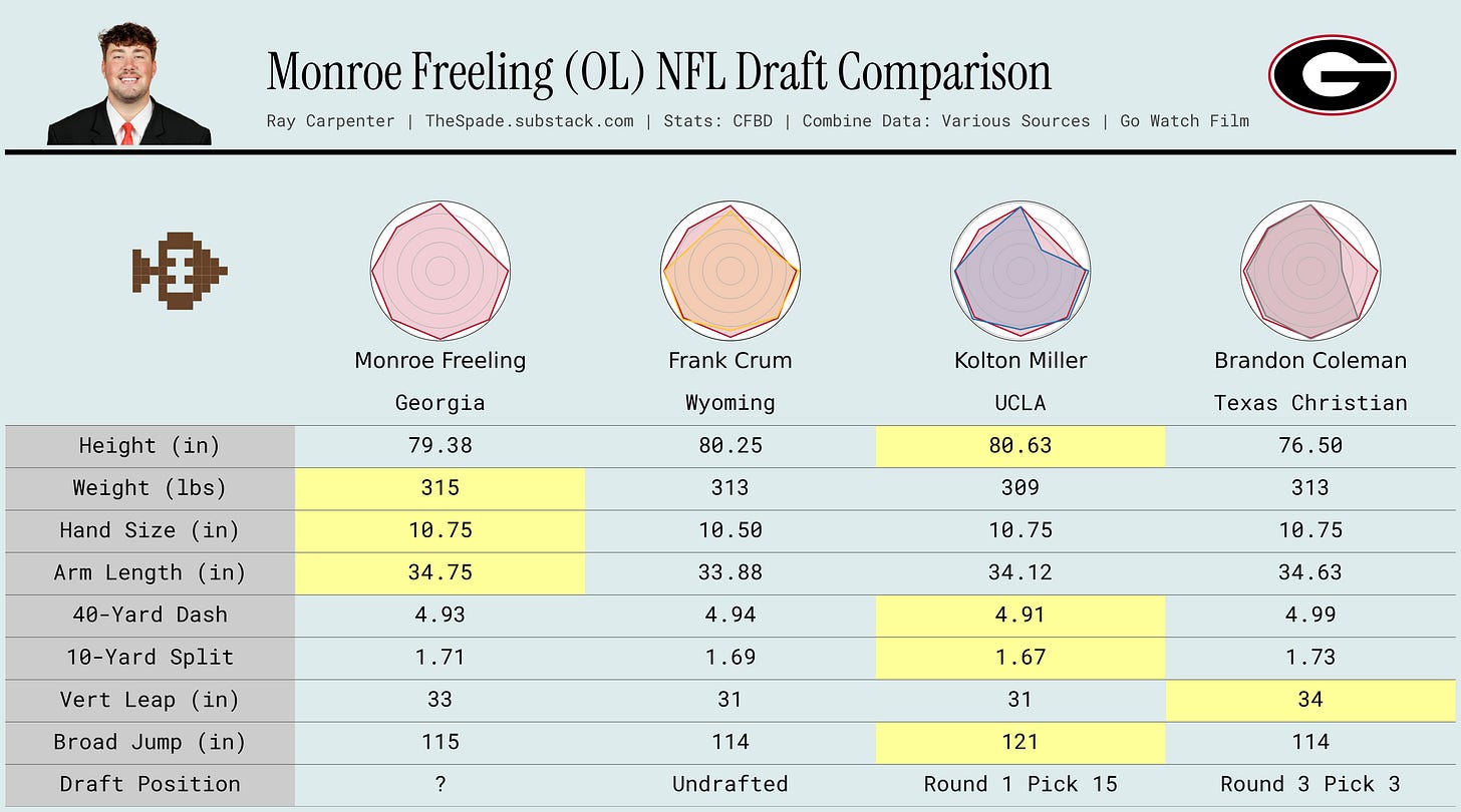 I added the caveat of “Go Watch Film” in the subtitle to offset the wonky comparisons that might pop up, especially for positions like offensive linemen that are more combine measurements based since they don’t have many free stats available online.