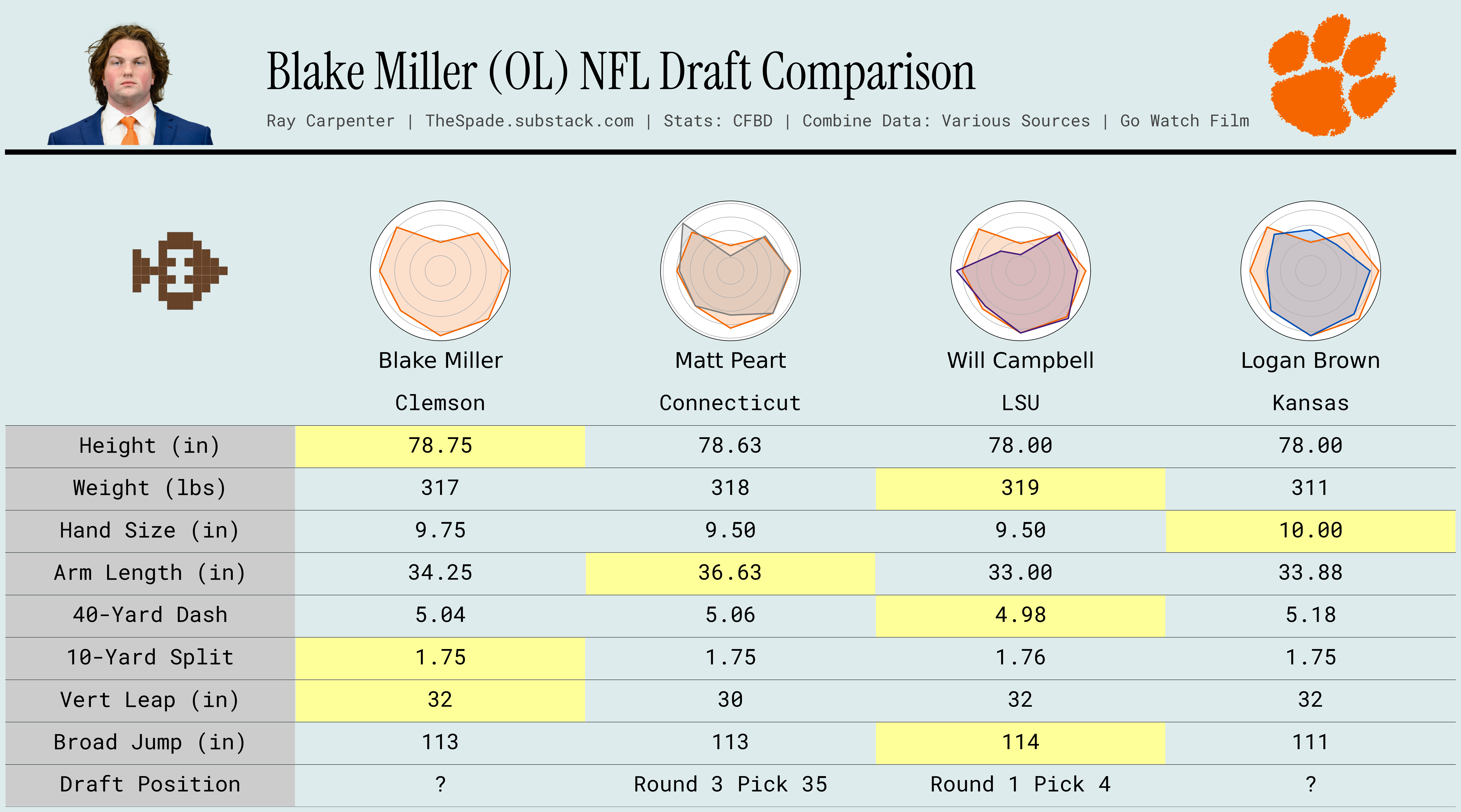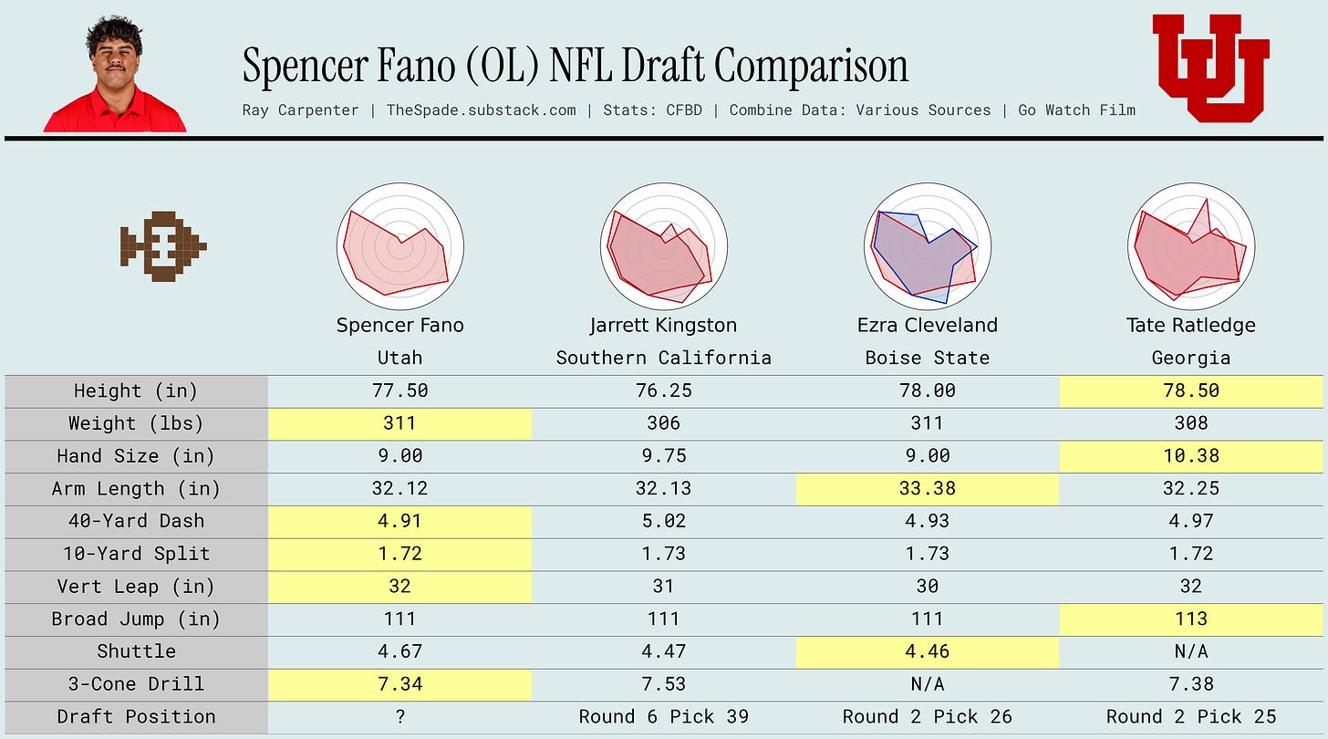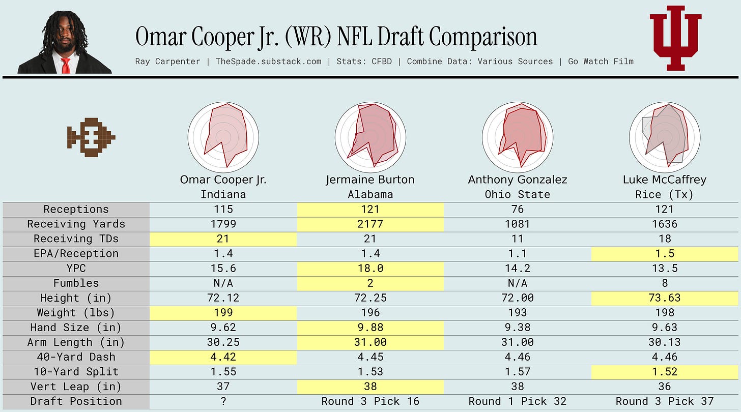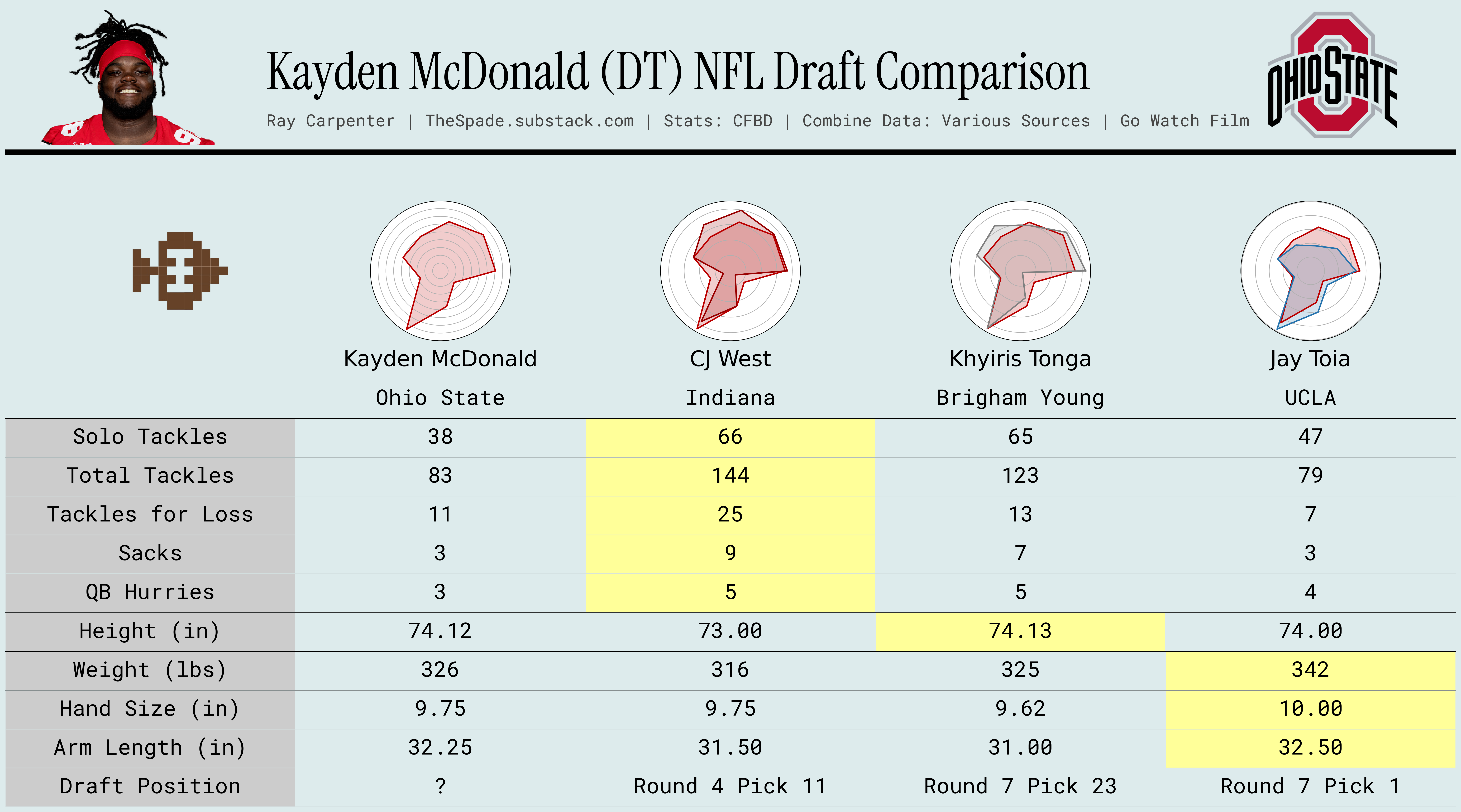 I added the caveat of “Go Watch Film” in the subtitle to offset the wonky comparisons that might pop up, especially for positions like offensive linemen that are more combine measurements based since they don’t have many free stats available online.