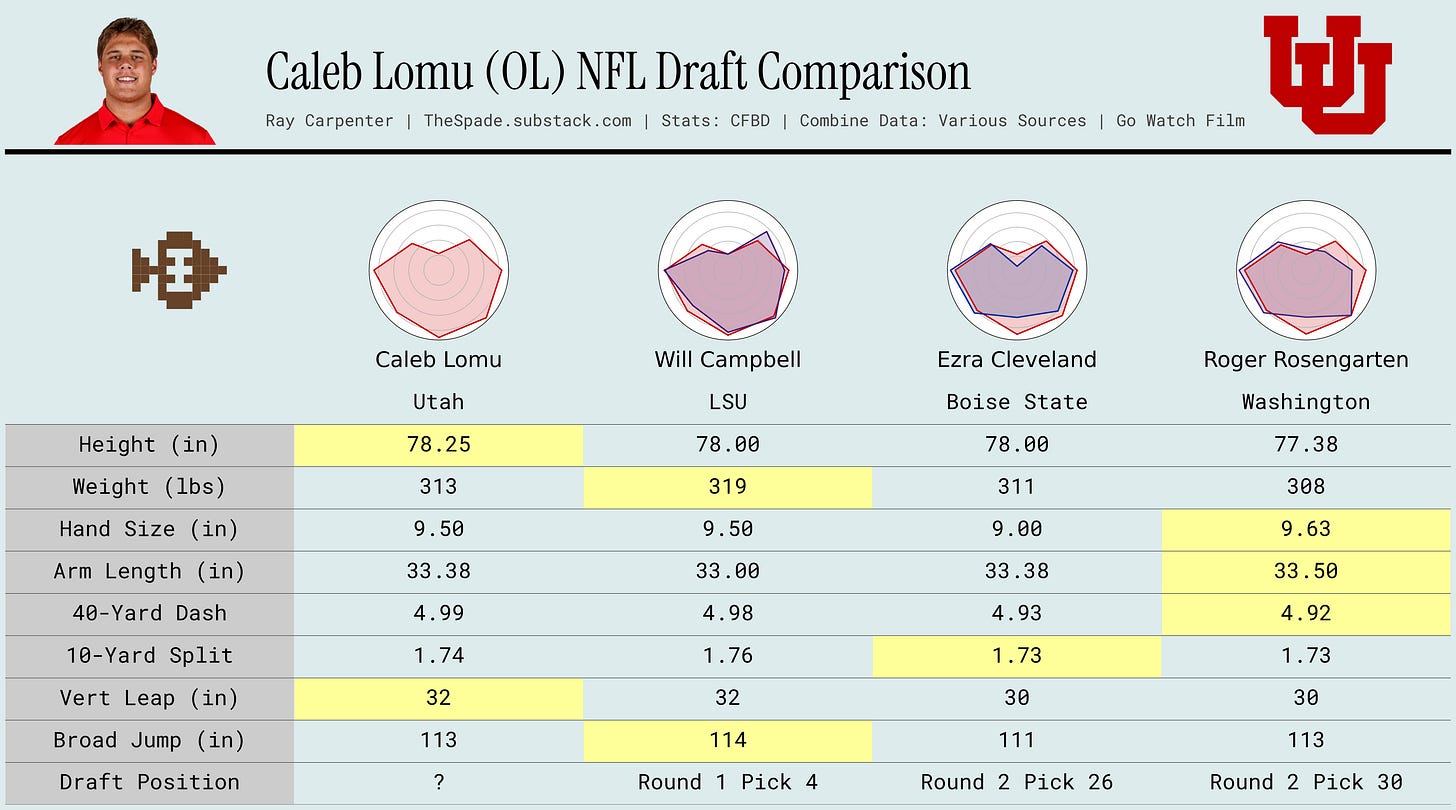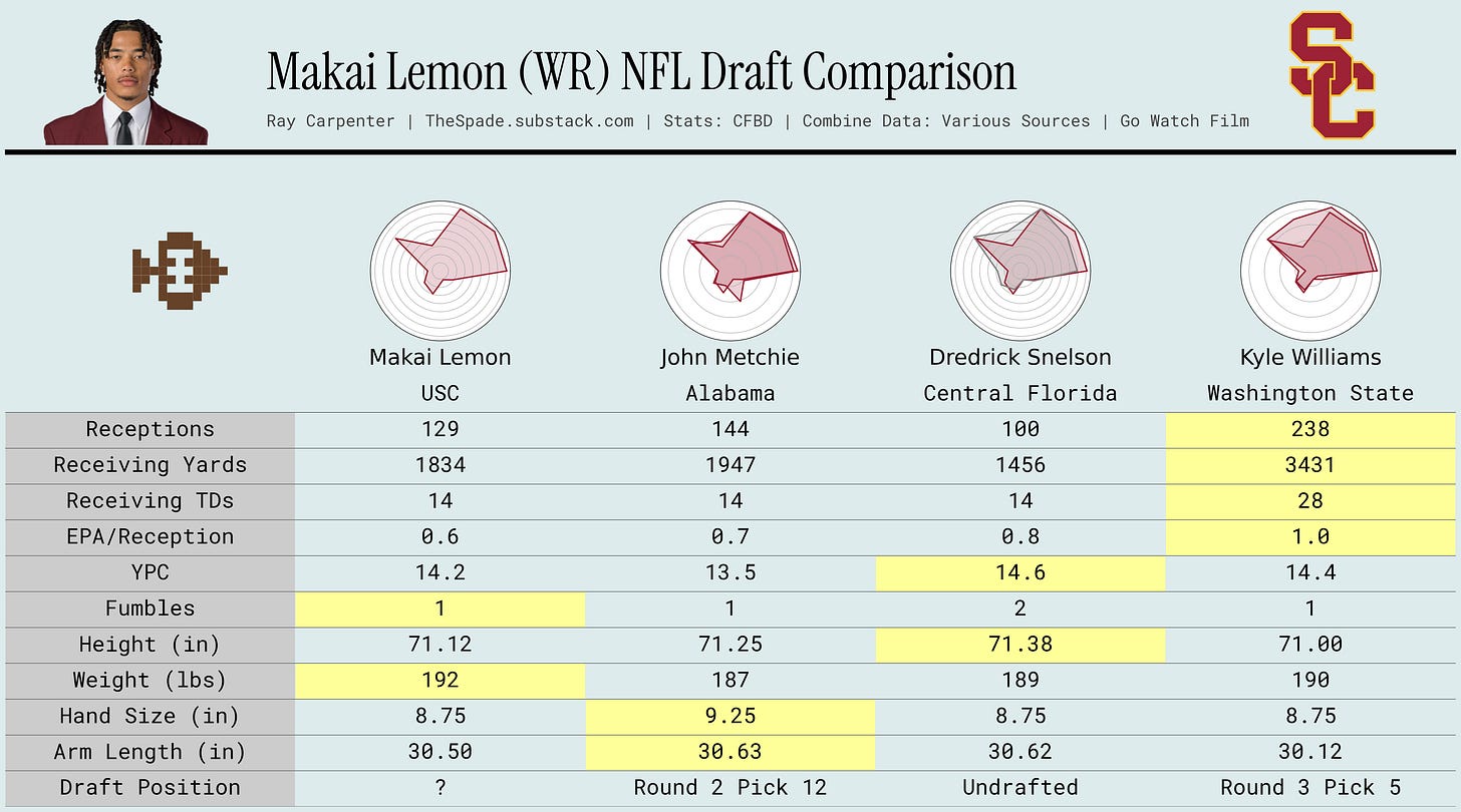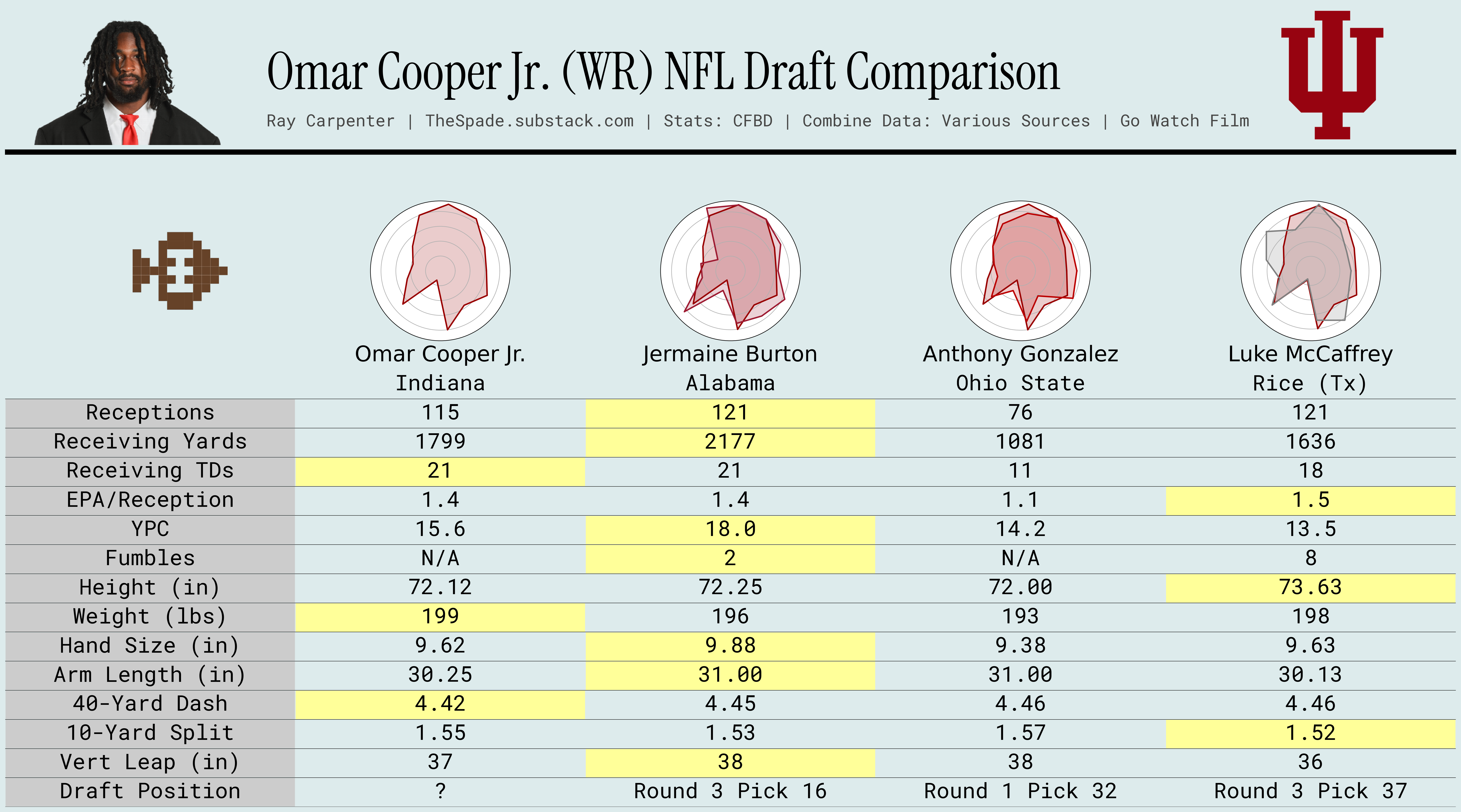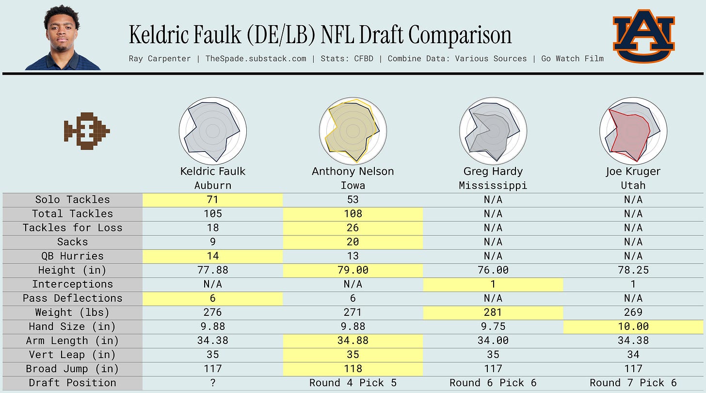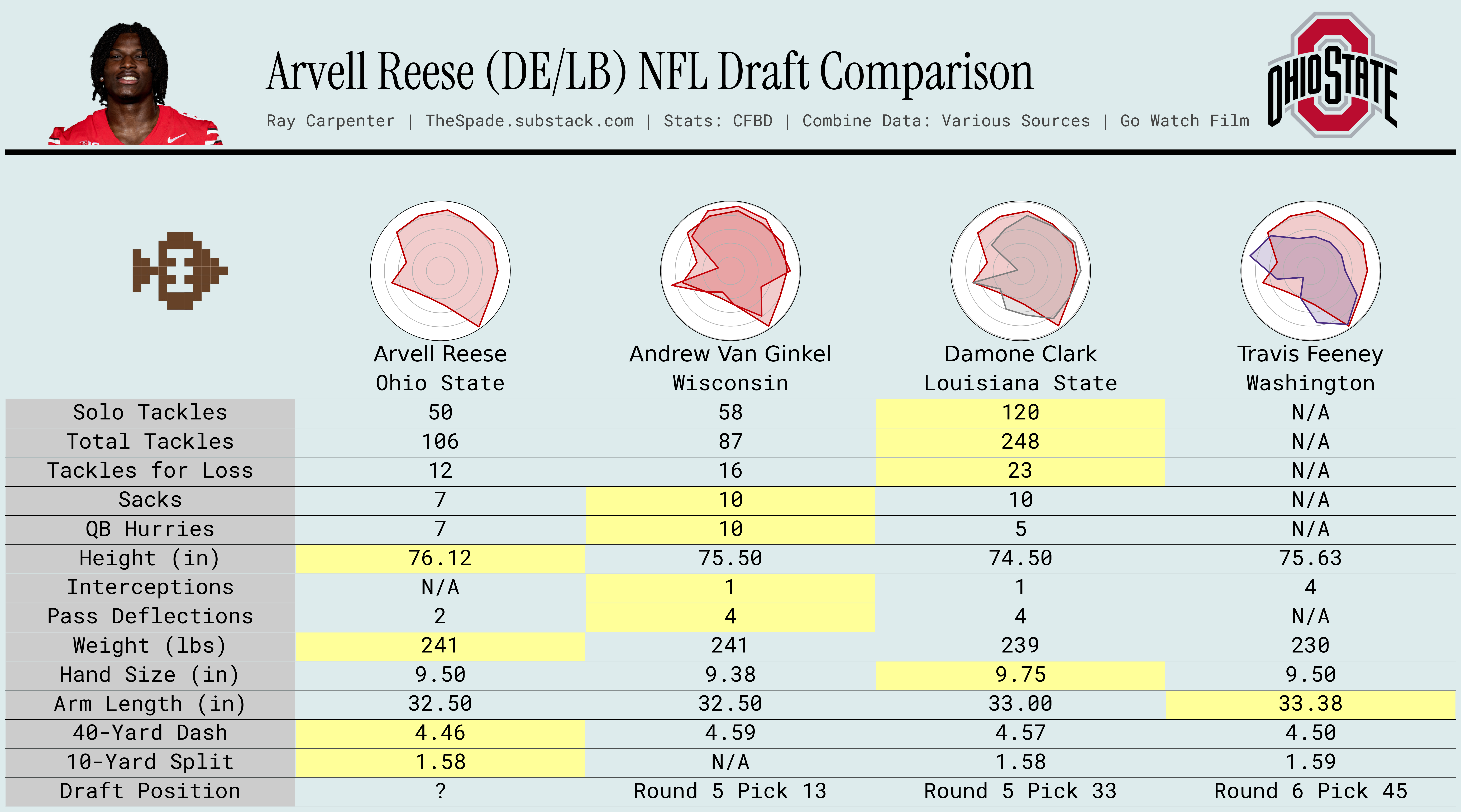 I added the caveat of “Go Watch Film” in the subtitle to offset the wonky comparisons that might pop up, especially for positions like offensive linemen that are more combine measurements based since they don’t have many free stats available online.