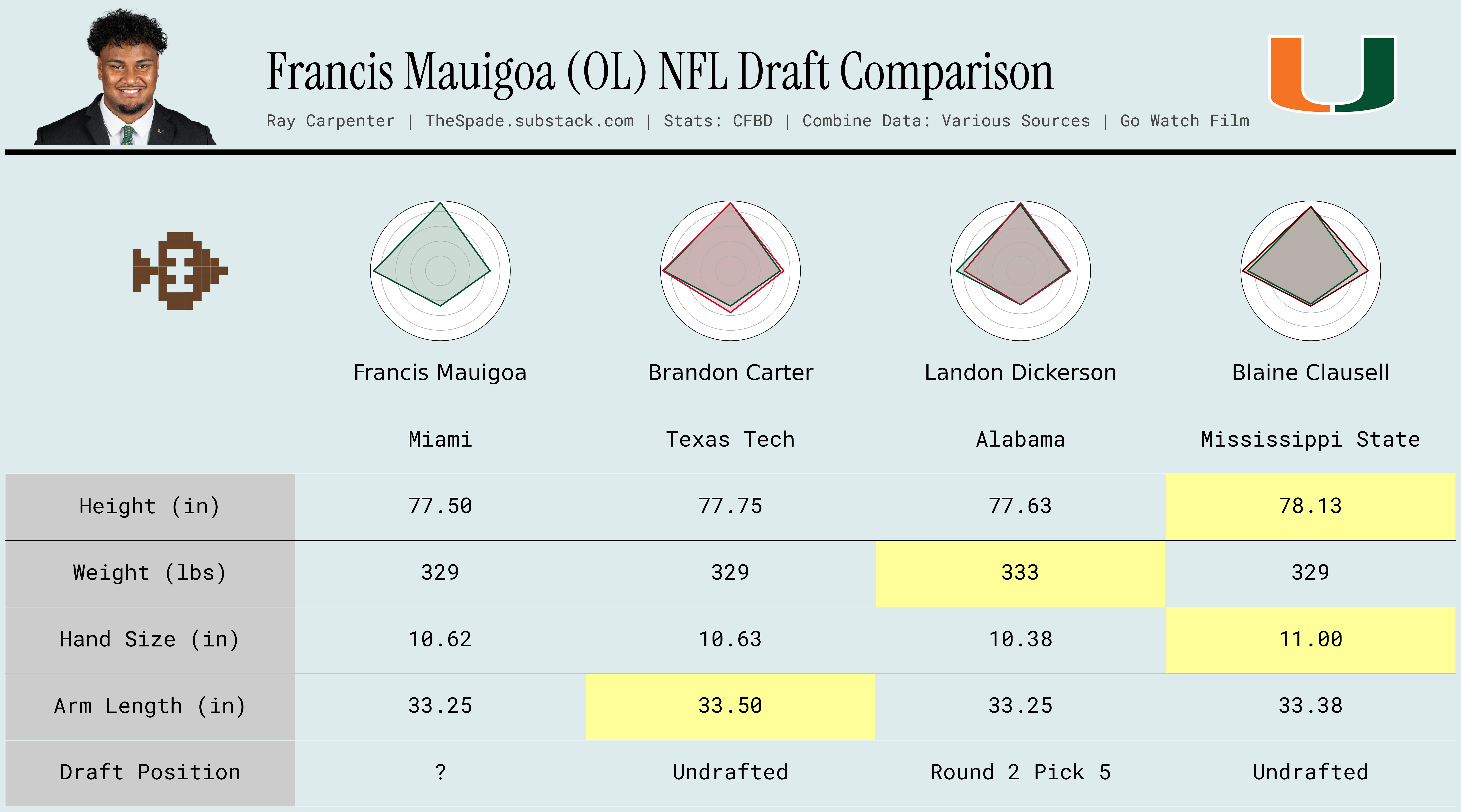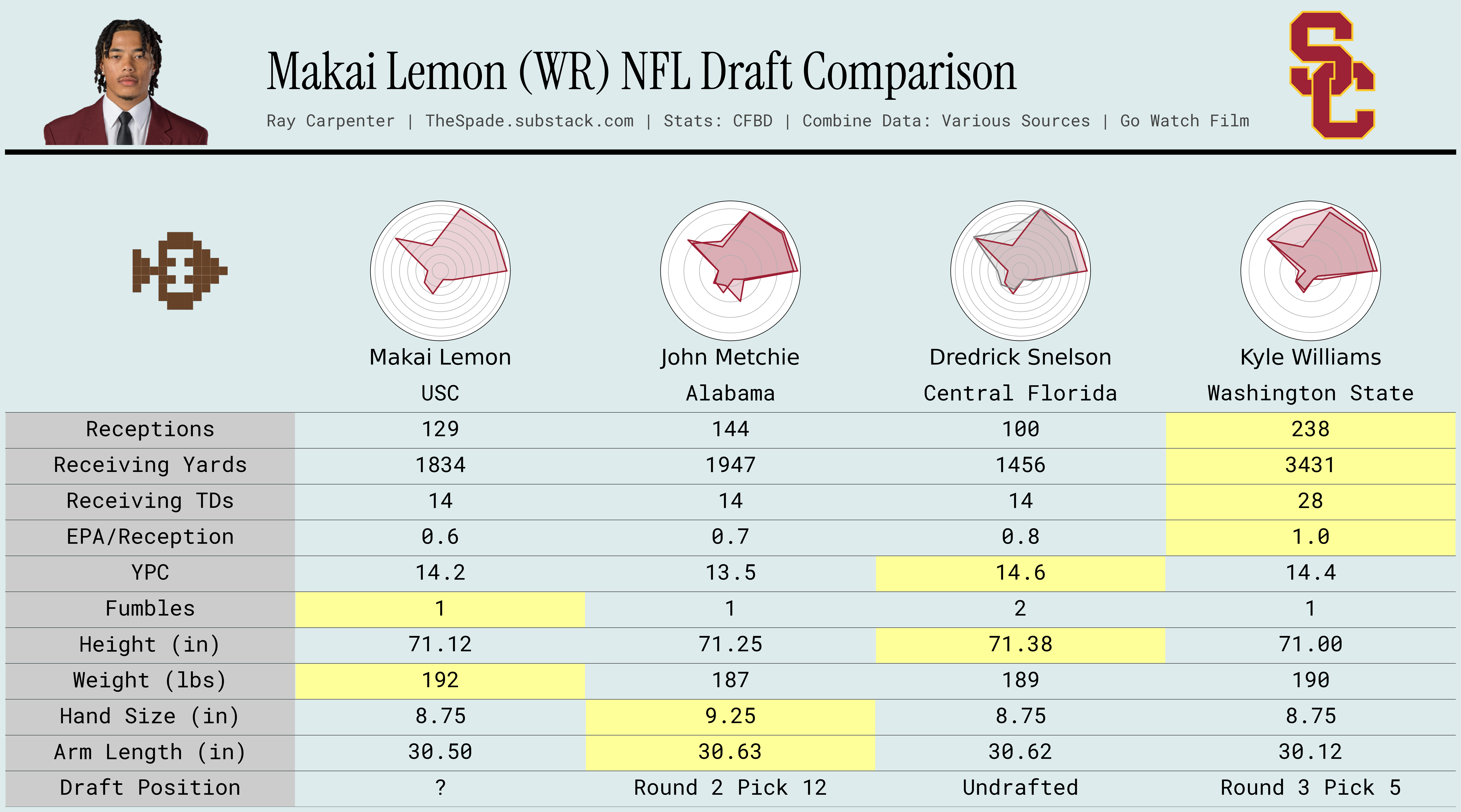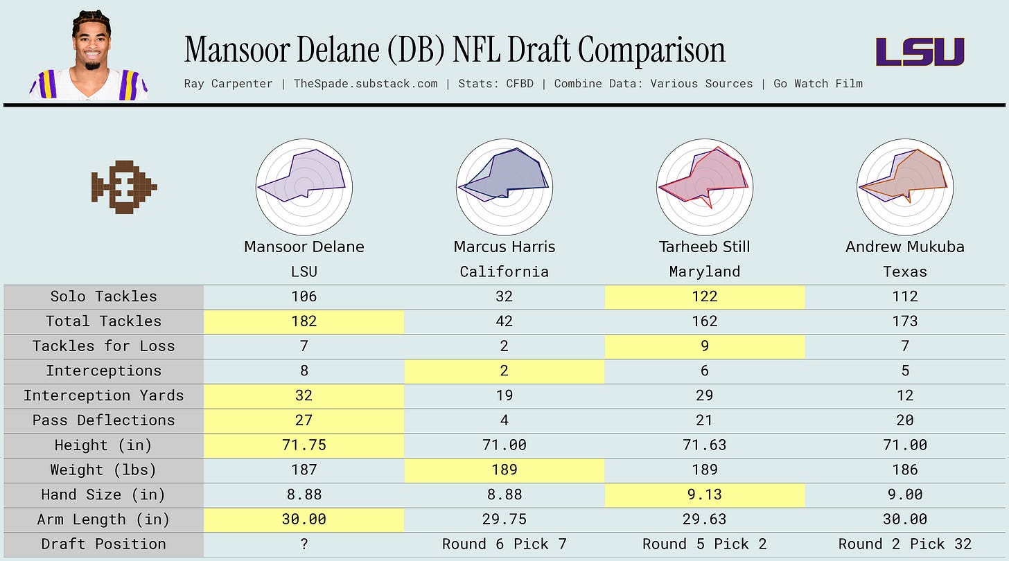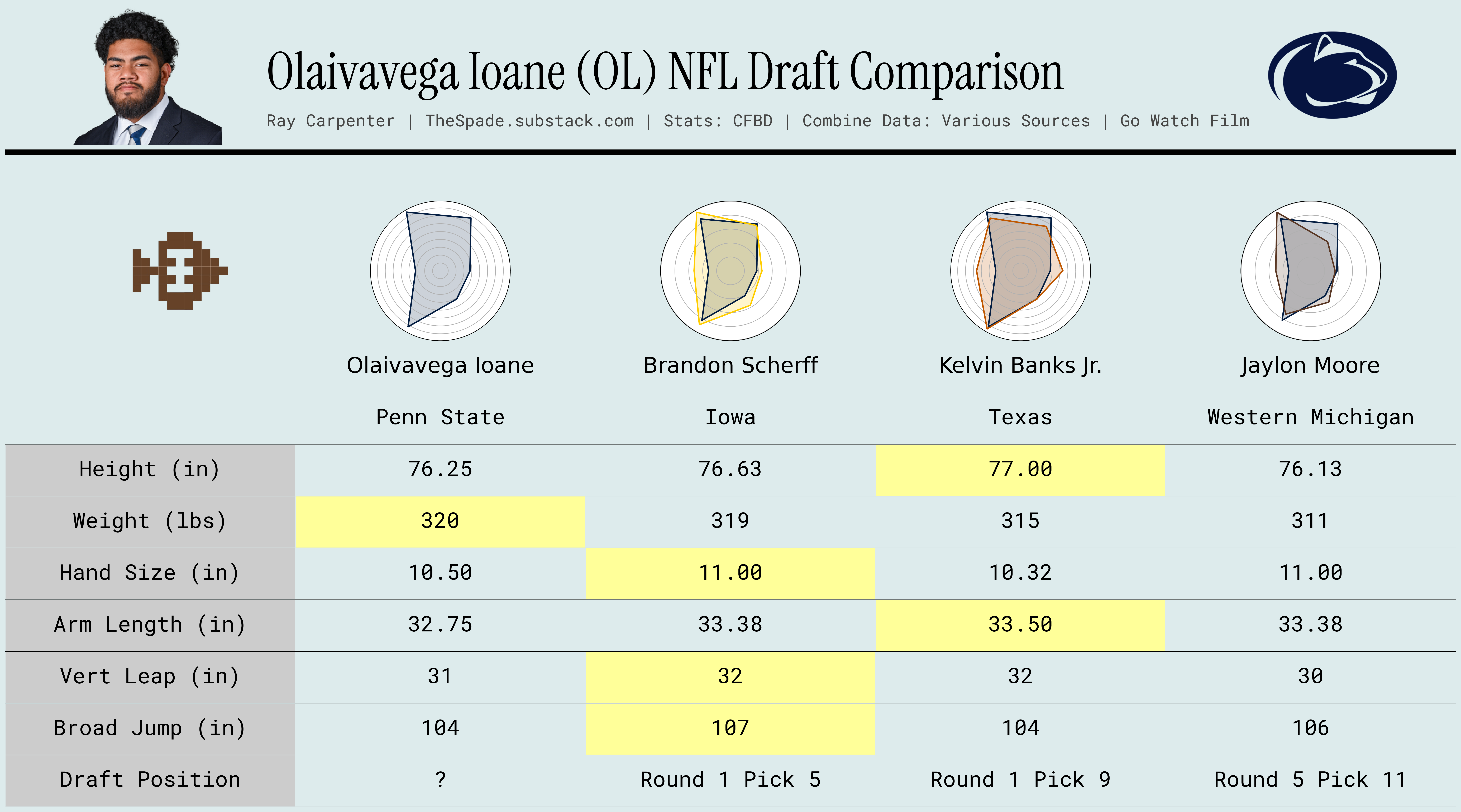 I added the caveat of “Go Watch Film” in the subtitle to offset the wonky comparisons that might pop up, especially for positions like offensive linemen that are more combine measurements based since they don’t have many free stats available online.