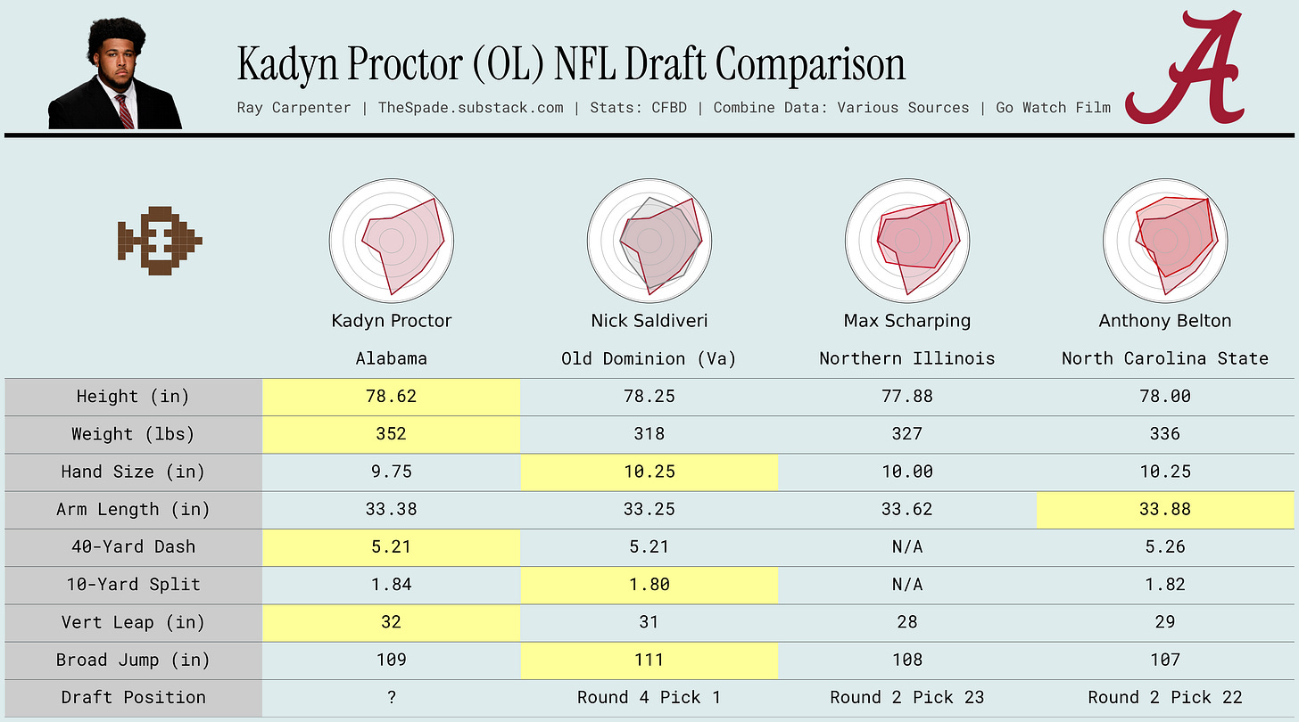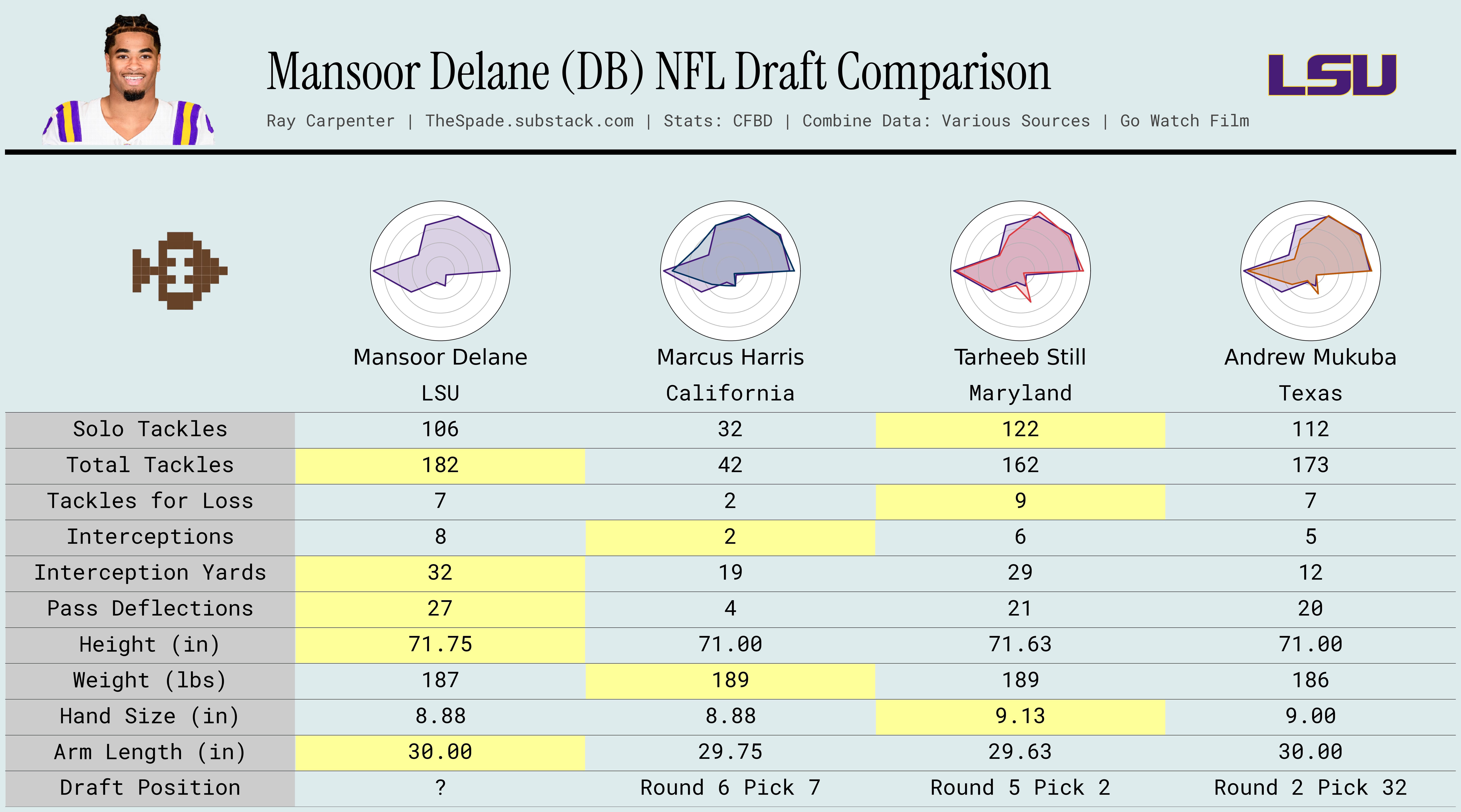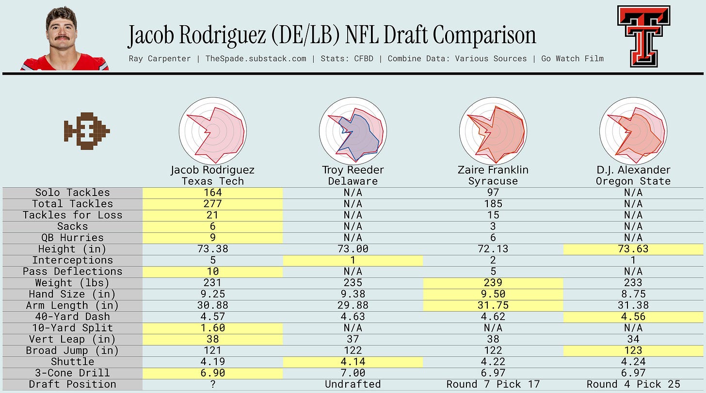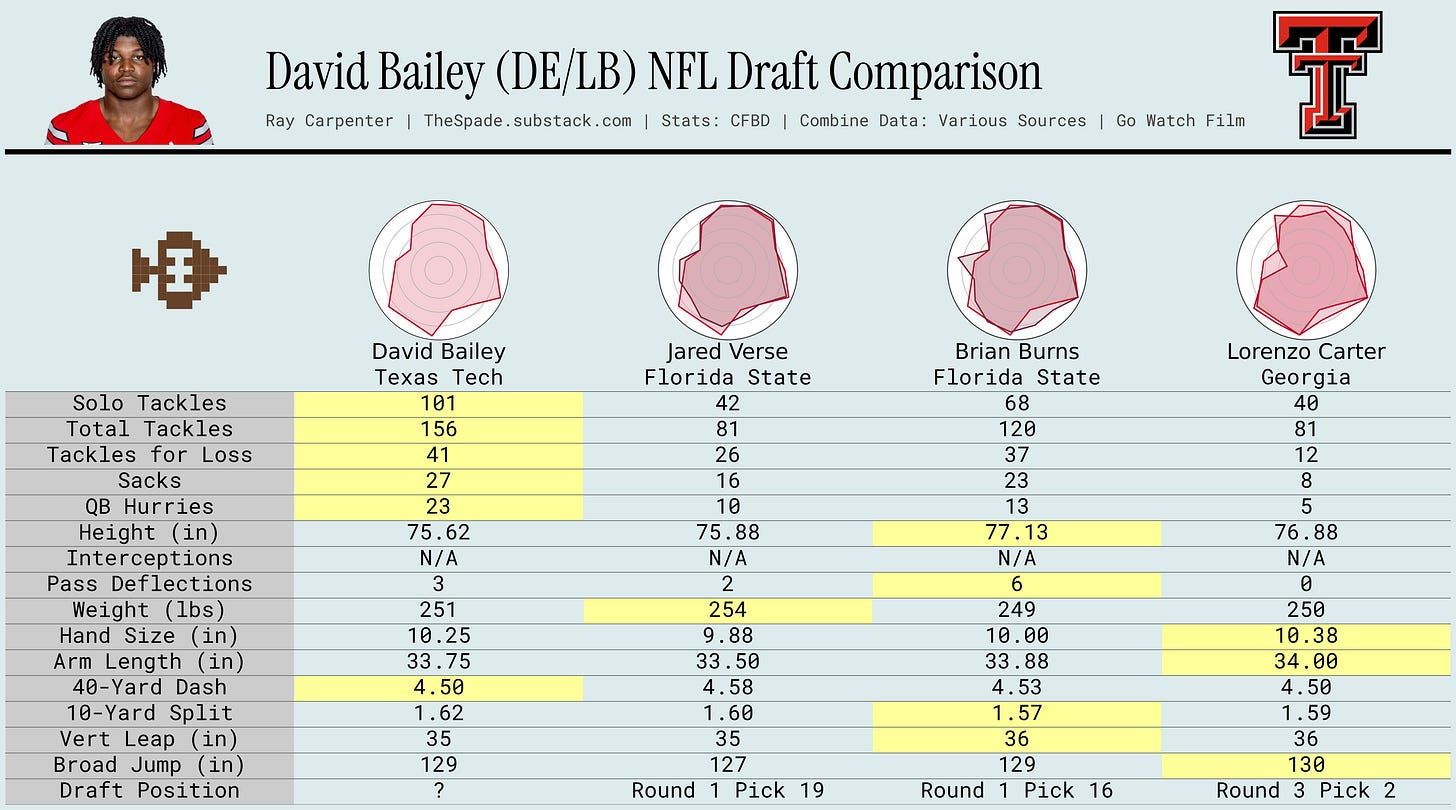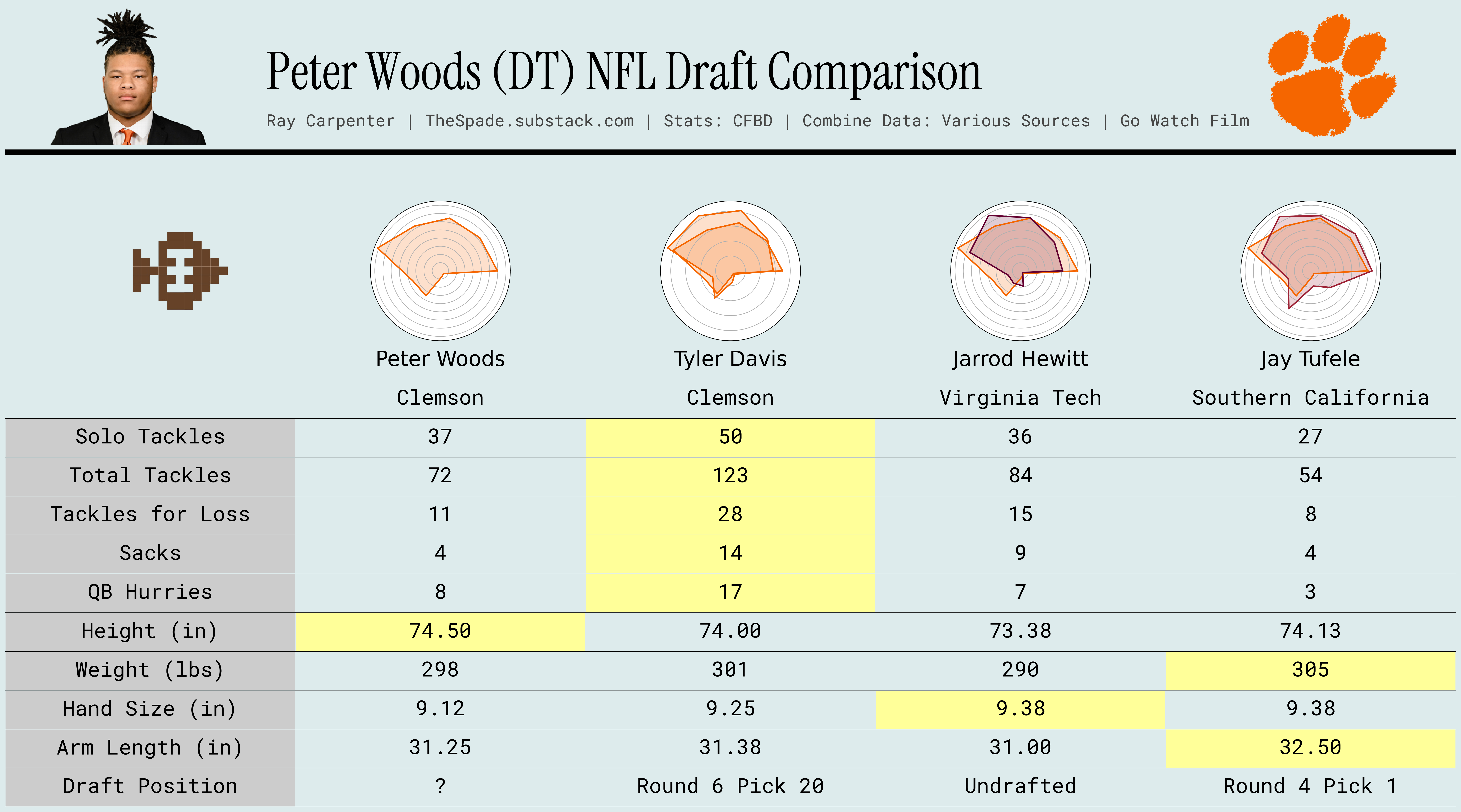 I added the caveat of “Go Watch Film” in the subtitle to offset the wonky comparisons that might pop up, especially for positions like offensive linemen that are more combine measurements based since they don’t have many free stats available online.