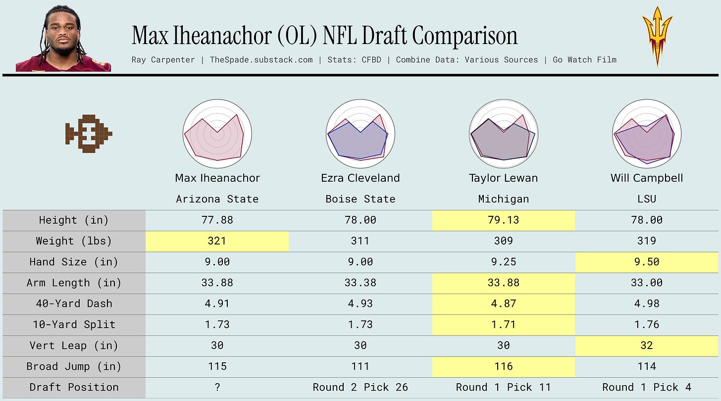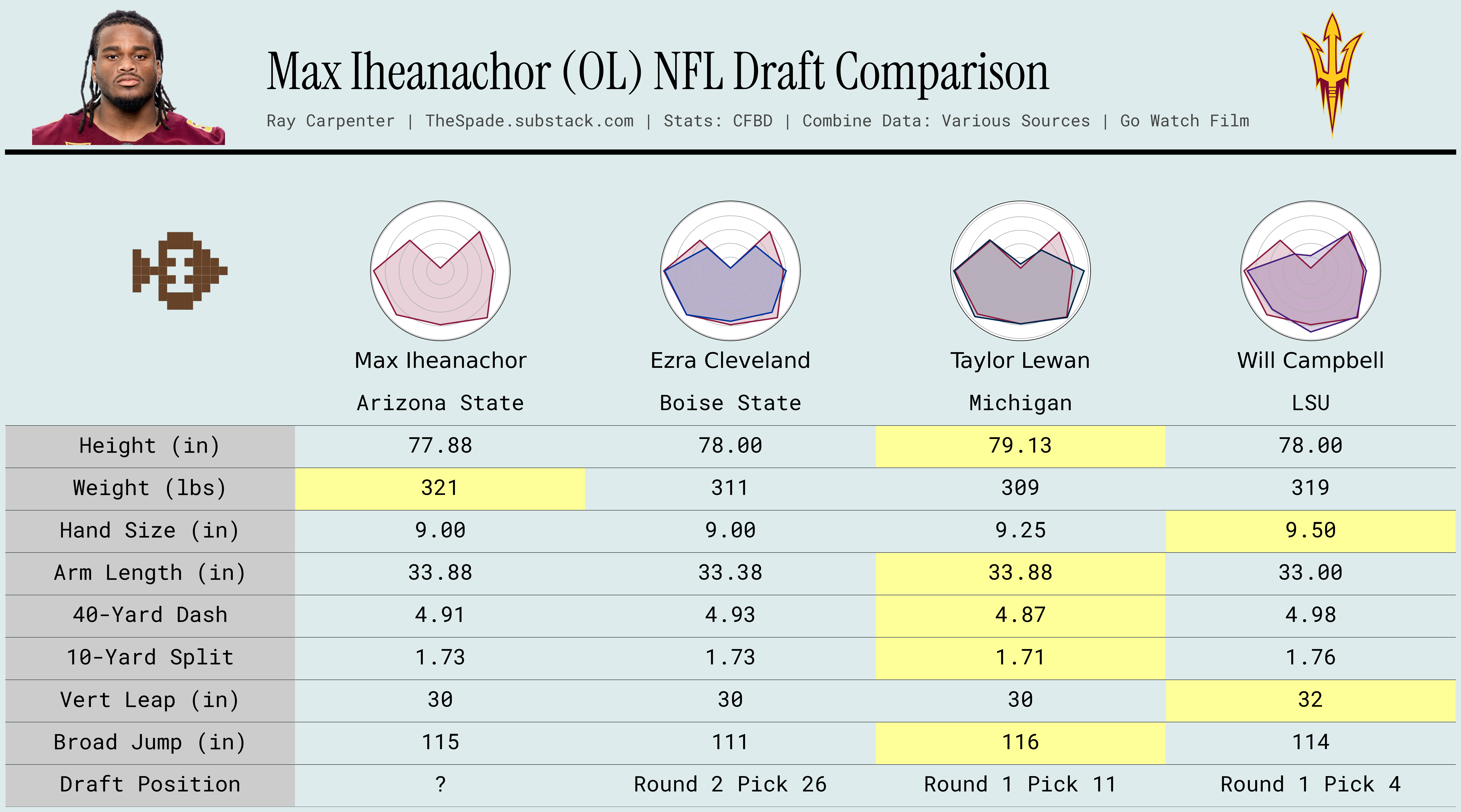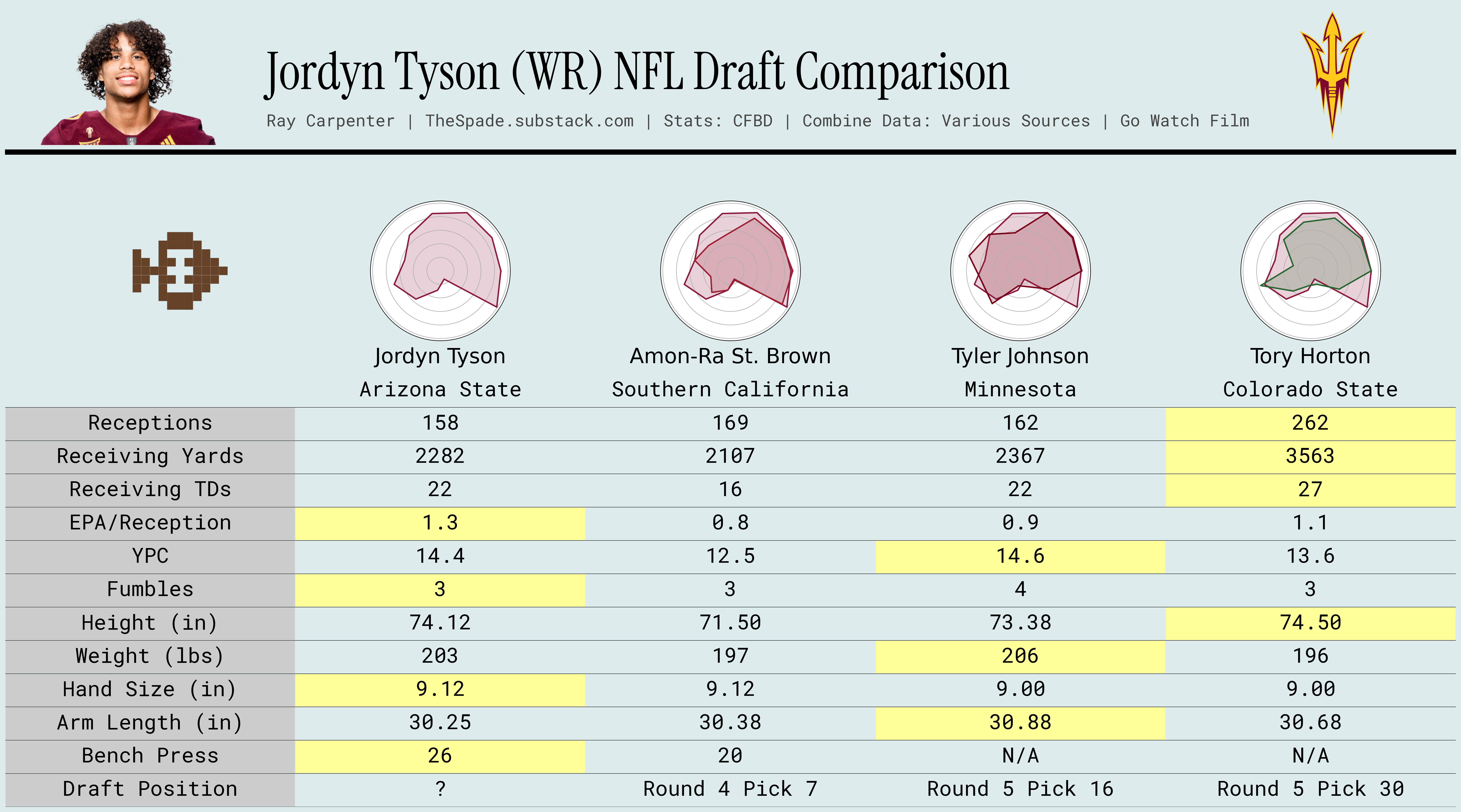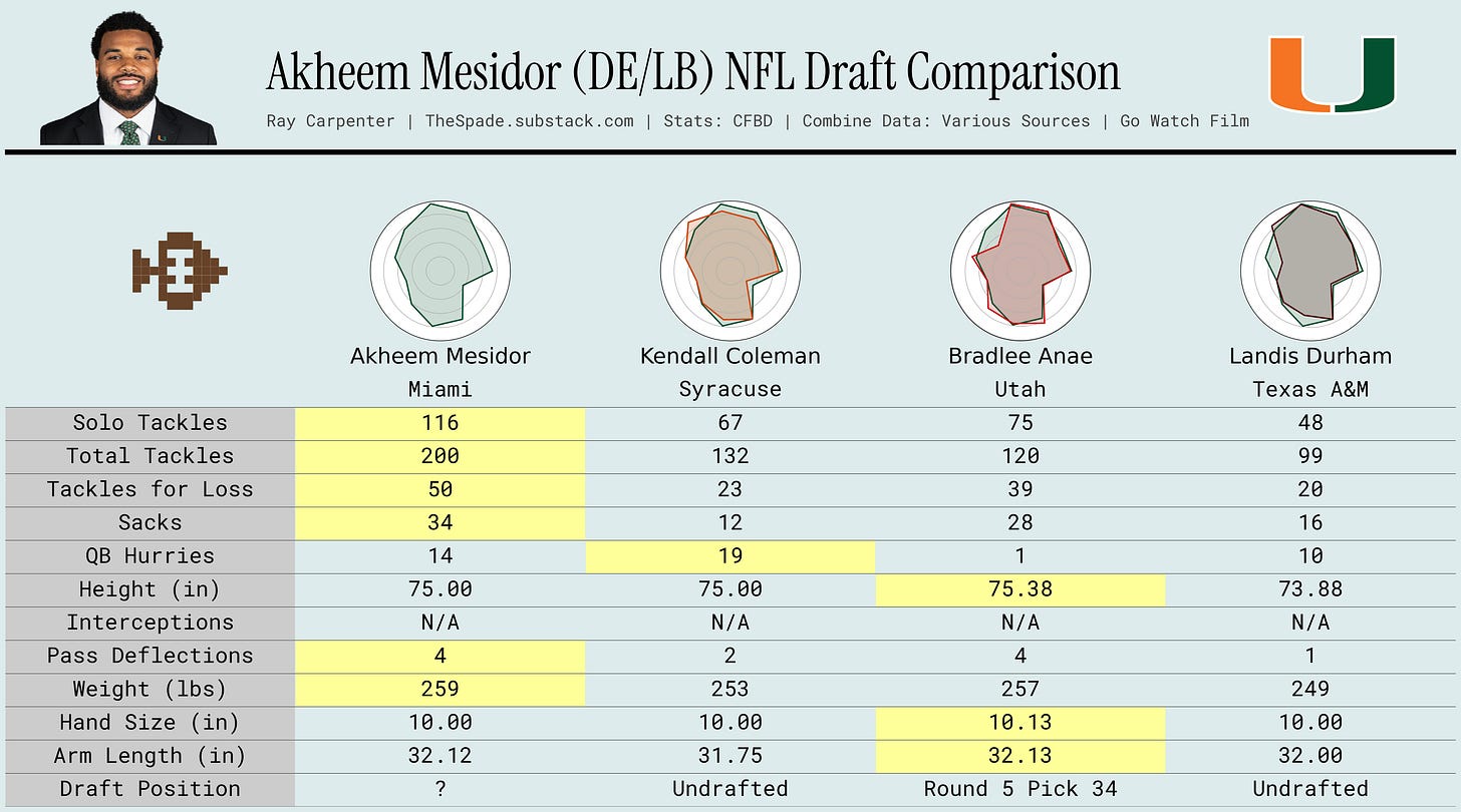I added the caveat of “Go Watch Film” in the subtitle to offset the wonky comparisons that might pop up, especially for positions like offensive linemen that are more combine measurements based since they don’t have many free stats available online.
