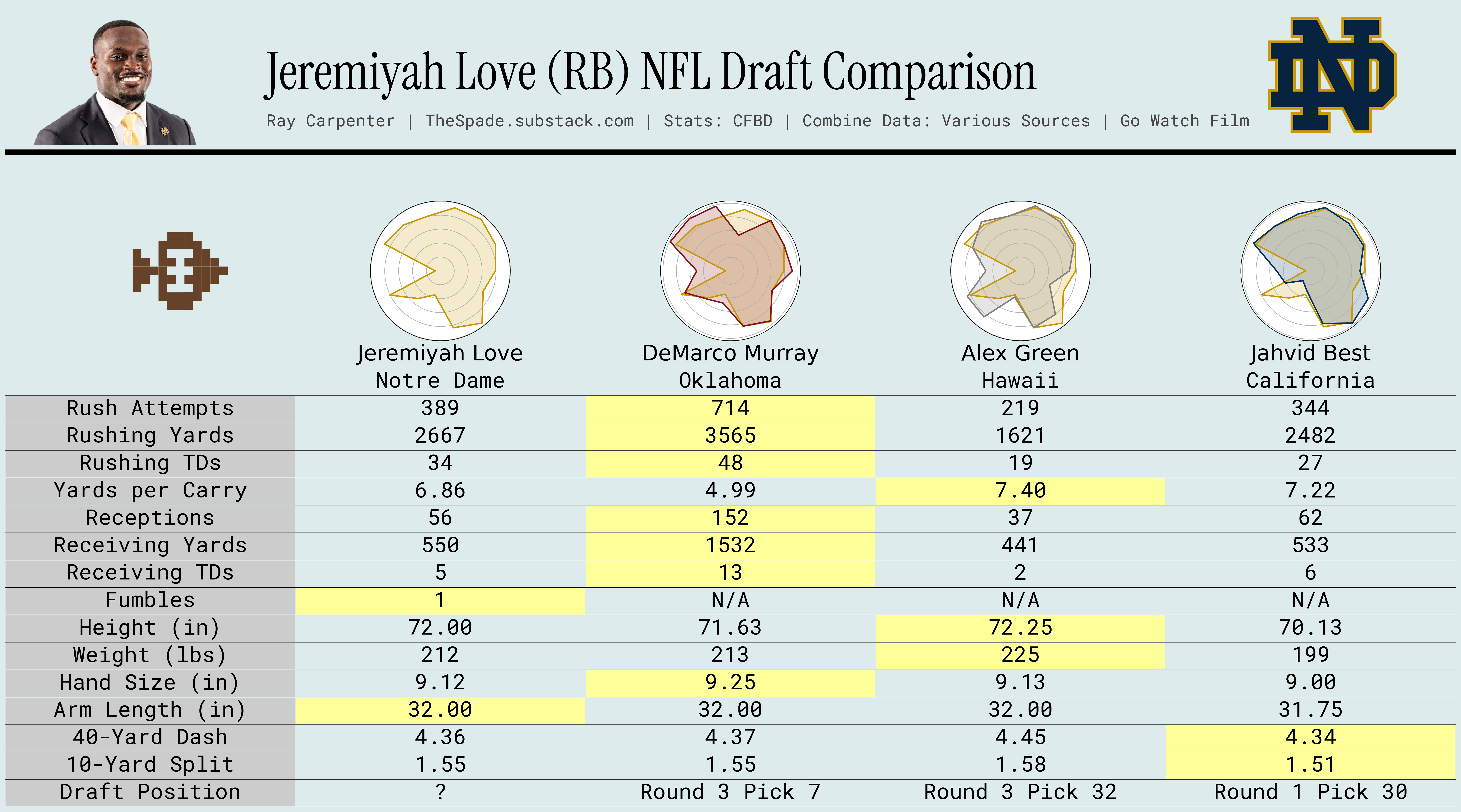 Reminder that my model and Daniel Jeremiah got the same comp for Love, Demarco Murray. That was cool. I have a half-baked idea to write a CFB unsolved mysteries article about how no one knows how many fumbles Demarco Murray had in college, but we’ll save that for another day.