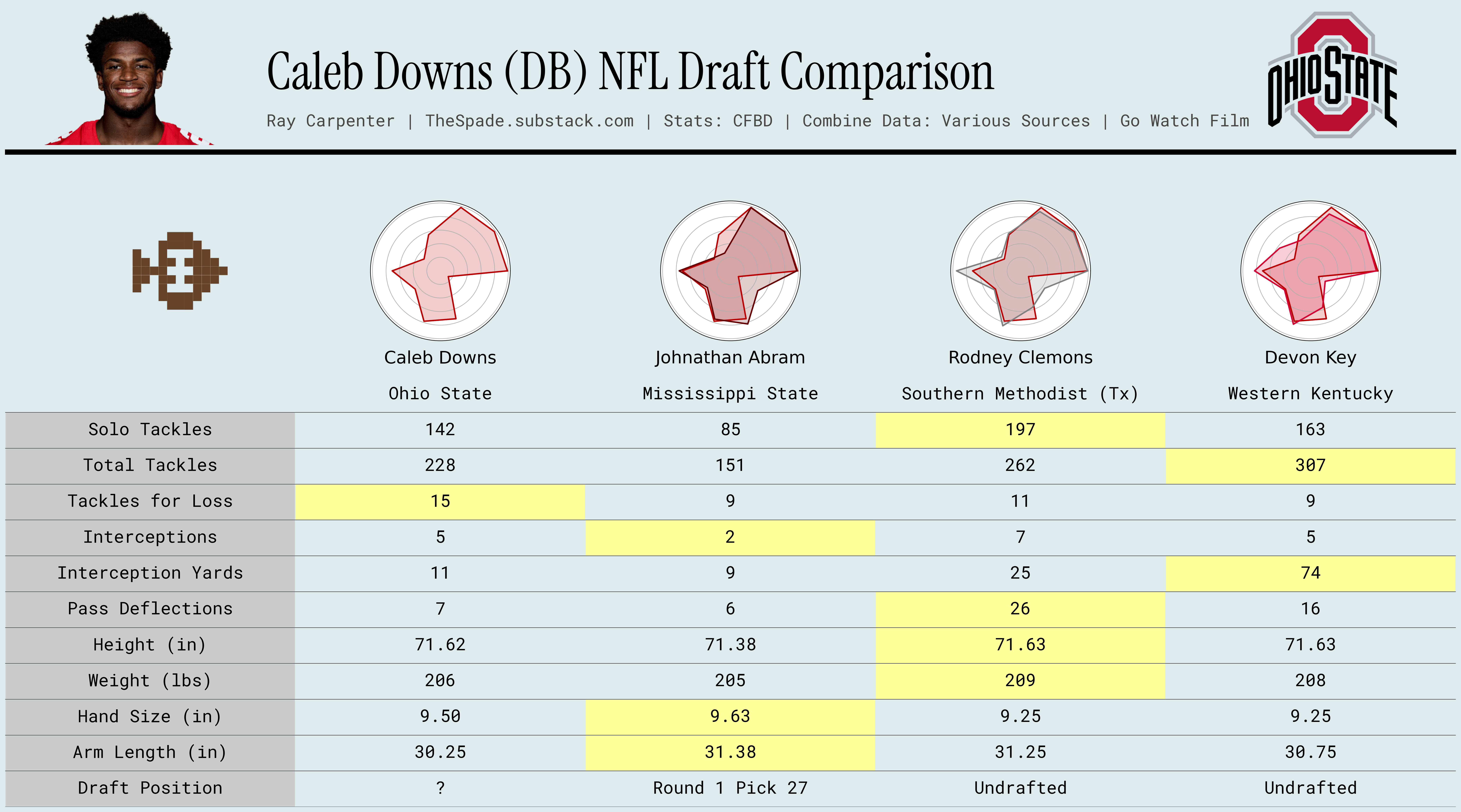 I think the Caleb Downs foot injury stuff is probably smoke from a team hoping he drops. But I see Downs going in Kyle Hamilton territory in the first round.
