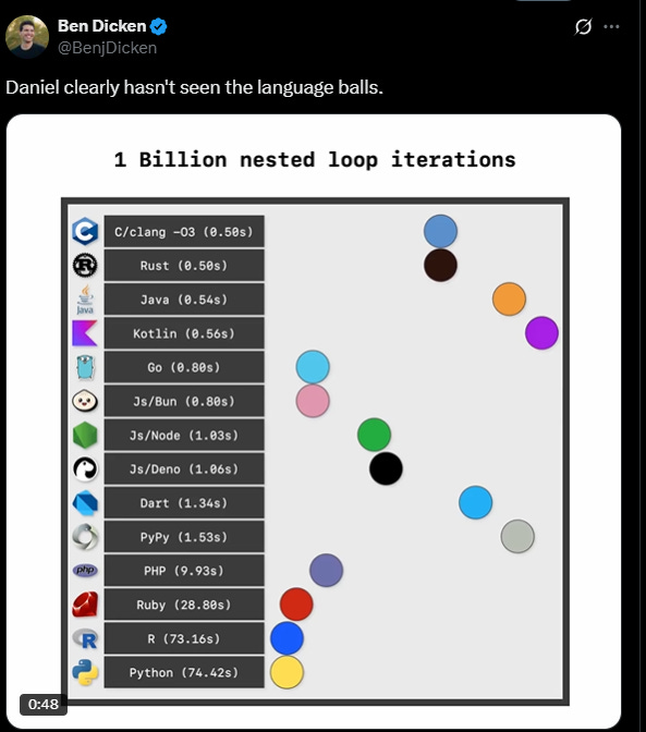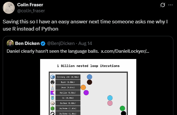 This nod to Python vs. R was brought on by a tweet I saw showing how long it takes to run 1 billion loops in some popular languages: